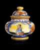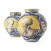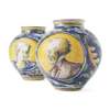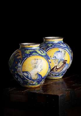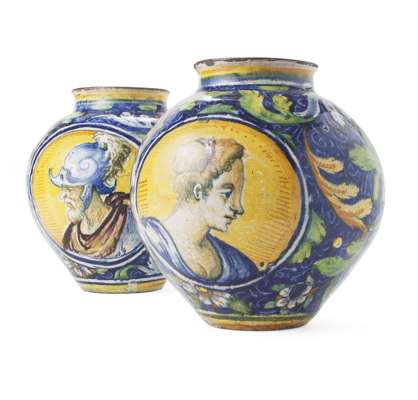each with a globular body with short narrow neck and flat unglazed base, painted in blue, green, yellow, orange, brown, purple, black and white, on one jar the image of a plumed helmeted soldier in profile within an oval plain unadorned panel with characteristic halo of yellow made by radiating orange and white streaks, on the reverse wall three quarter bust of a woman, her hair tied in a ribbon, wearing a pearl earring looking to the right; on the other jar on a similar panel the bust of a woman in profile, her hair tied with a ribbon with a similar halo, on the reverse wall a bearded male bust in profile with ruff, doublet and buttons, all panels reserved on a dark blue ground enriched with leaves, flowers and fruit and incised with short curved strokes, narrow blue and yellow banding on the base and neck (2)