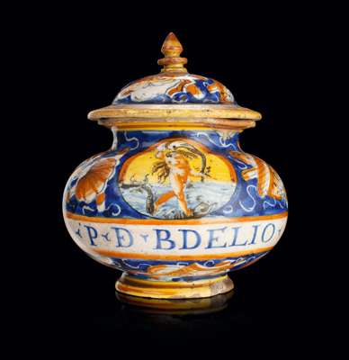 For a similar Venetian jar in the William A. Clark collection see Wendy Watson, Italian Renaissance Maiolica from the William A. Clark collection, p. 172, cat 69. 1986. For a similar but slightly larger Venetian jar with a profile of a helmeted man and a young woman see, Timothy Wilson and Elisa Paola Sani, Le maioliche rinascimentali nelle collezioni della Fondazione Cassa di Risparmio di Perugia, cat.79, p.240, Perugia 2006