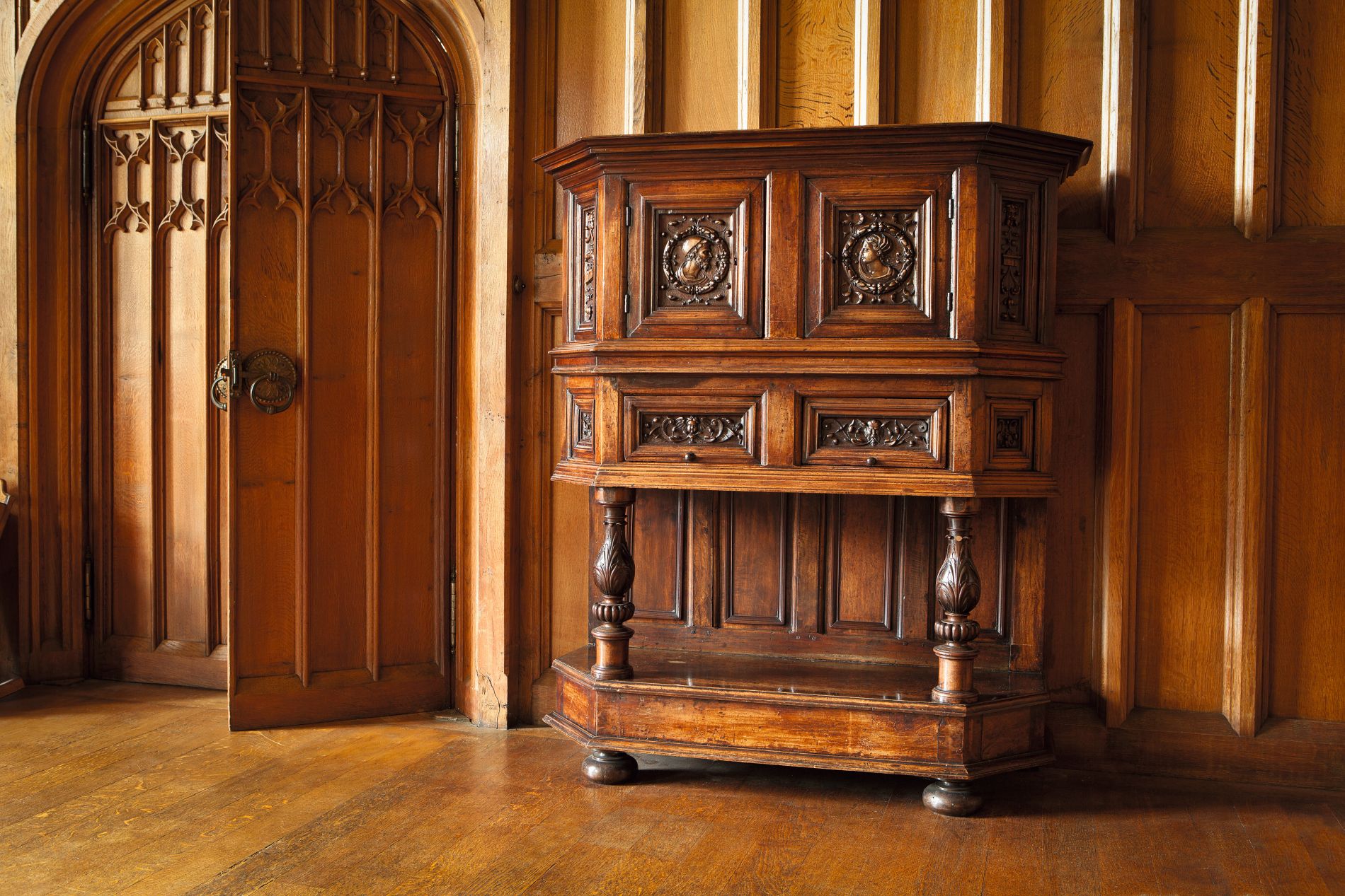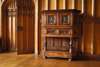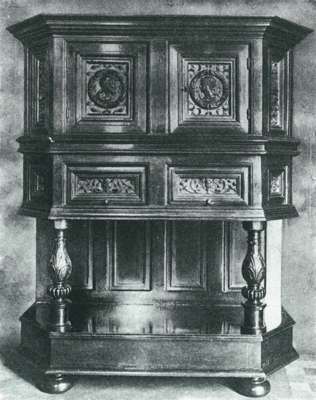in two parts: the canted top with a moulded cornice over a pair of cupboard doors carved with protrait medallions above a pair of frieze drawers carved with satyr masks and grotesques; the lower part with carved baluster supports joined by a conforming undertier and raised on bun feet