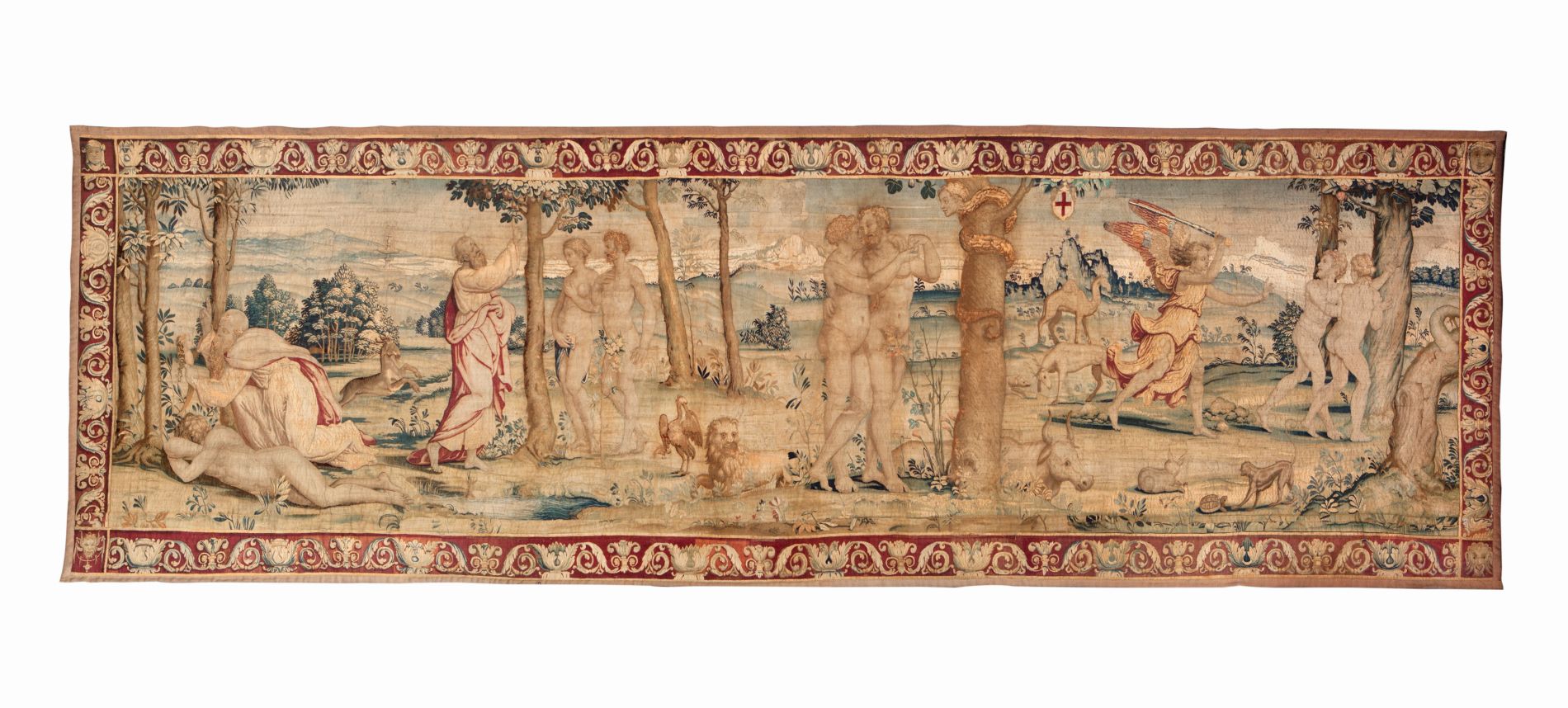 woven with scenes from Genesis Chapters 2 and 3 depicting the Creation of Adam, the union of Adam and Eve; placement in the Garden of Eden; the Tempation at the Tree of Knowledge of Good and Evil; and the Fall and Expulsion from the Garden; with various animals and plants, in a four sided deep border with foliate scrolls and cartouches, marked at the corners with masks, the field with a Cross of St. George cartouche