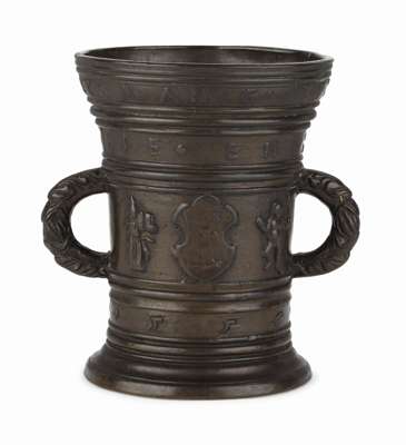 the waisted body with two bands of text ALLEIN GOTT DIE EHR and GOTTES GEWAT IST MANIG FLT and a central cartouche flanked by figures, with loop handles to the sides