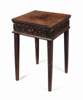 the square top above a blind fret carved frieze, raised on square tapered legs