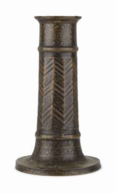 Note: The use of such candlesticks or torch-stands, of which numerous examples exist, has been much debated. However the consensus is now that these objects were only used as torches (mash’al in Persian). This kind of cylindrical pillar shape clearly appeared in the second quarter of the sixteenth century and may come from north-western India. The shaft of pillar-candlesticks may have changed from the smooth to the faceted type around the mid sixteenth century, probably in western Iran.