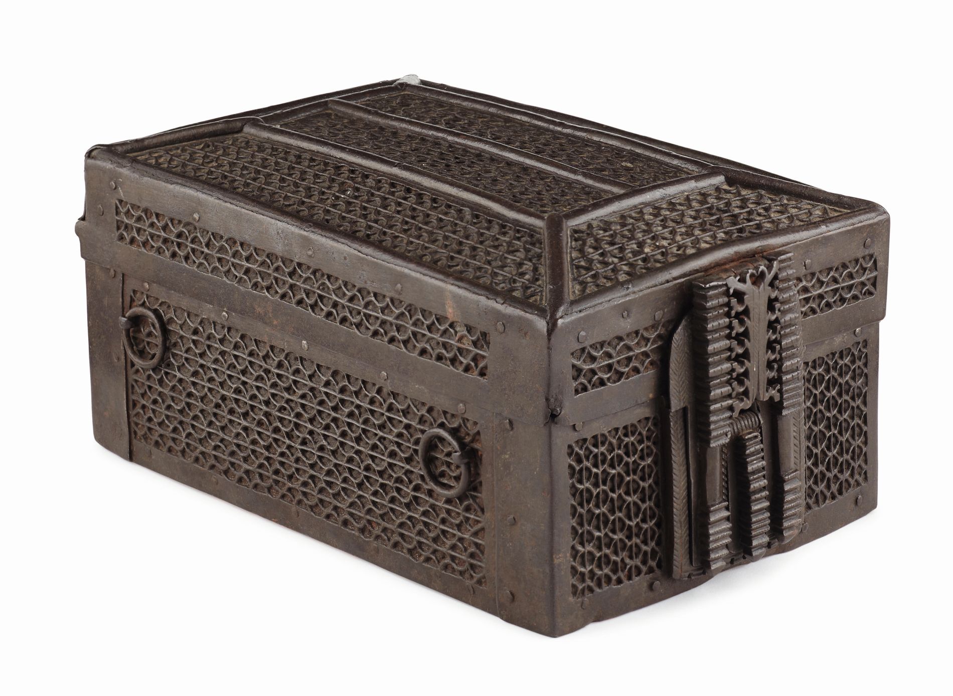 the hinged panel dome cover opening to an oak lined interior, the exterior decorated with wirework filigree, with a hinged lockplate and side securing rings
