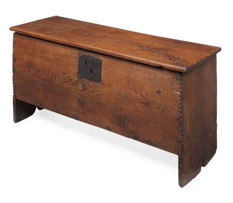 the hinged lid and sides with chip carved decoration, raised on trestle end supports