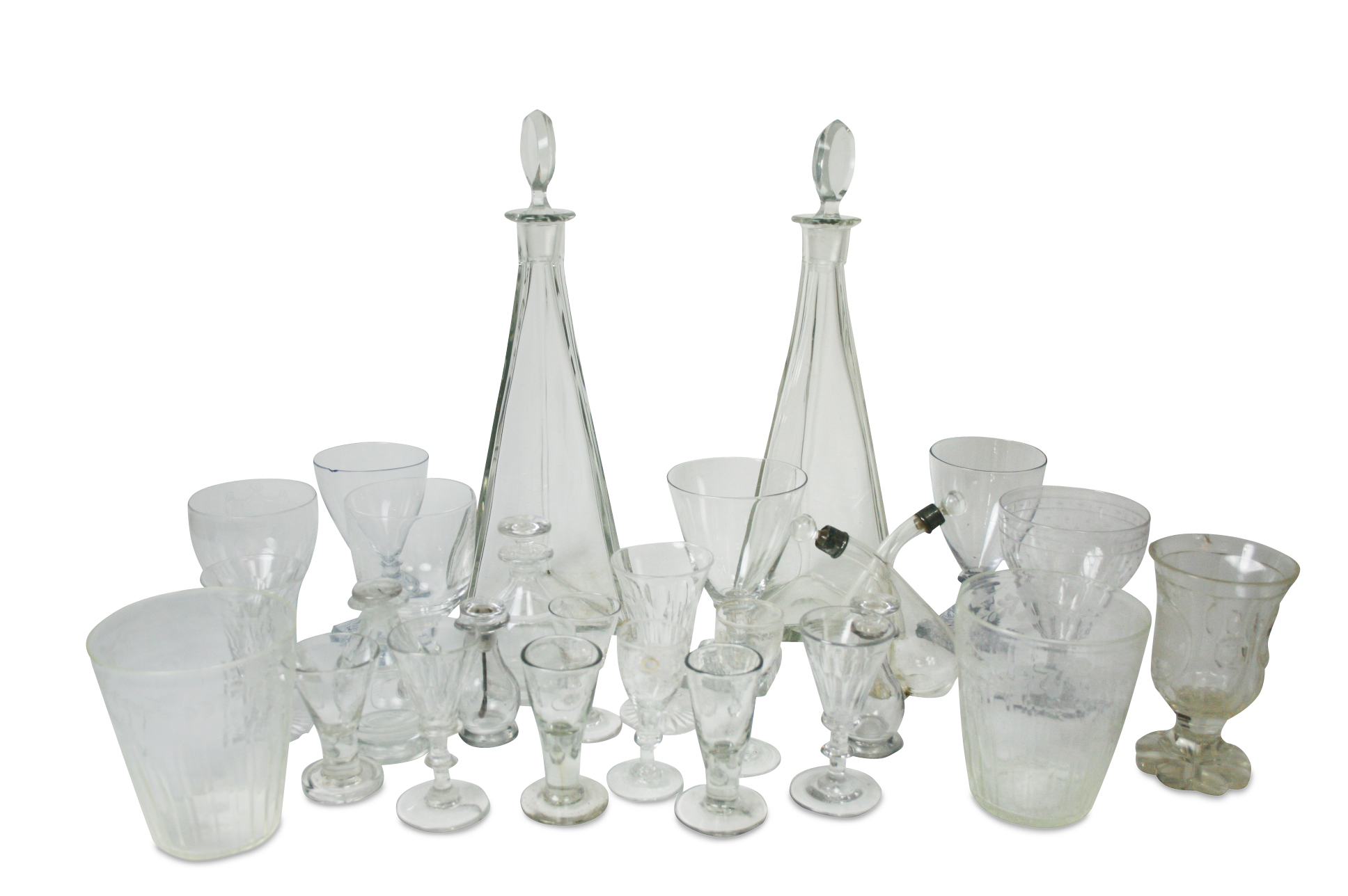 comprising a selection of cordial glasses, rummers nd cruets, of various sizes, some with etched decoration (qty)