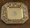 of canted square form centred by an engraved armorial crest, within an ornate openwork fruiting vine chased border