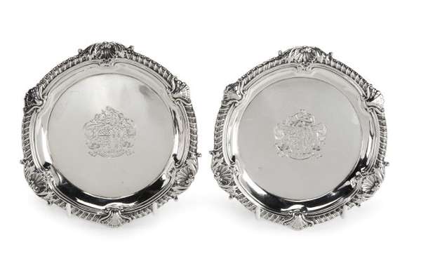 of shaped circular form with shell and gadrooned cast rim, centred by an engraved armorial crest, raised on three scroll feet (2)