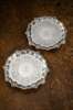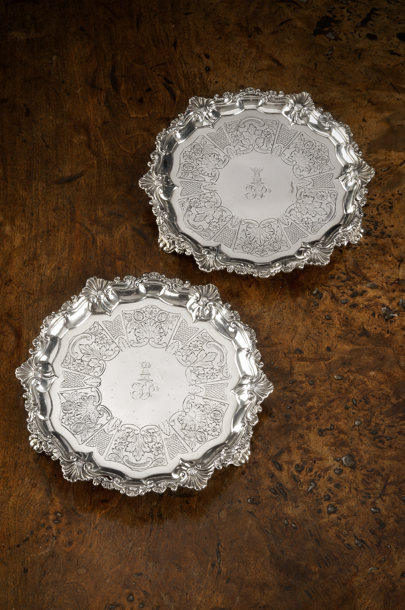 of shaped circular form, with shell and scroll cast border, centred by foliate engraved decoration and crest with monogram, and raised on three scroll feet (2)