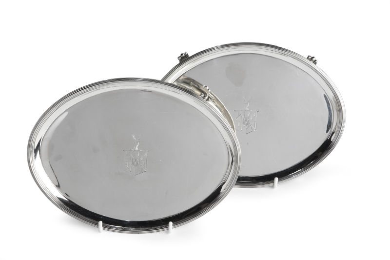 of oval form with a moulded edge, engraved armorial, raised on four scroll feet, engraved crest to underside (2)
