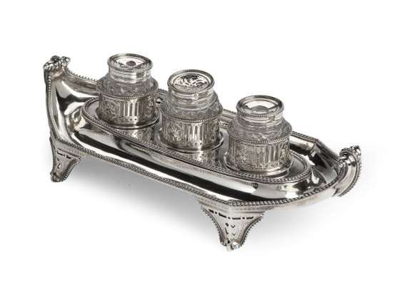 of boat shape form, with a bead moulded rim, surmounted by three cut glass bottles and raised on pierced bladed bracket feet