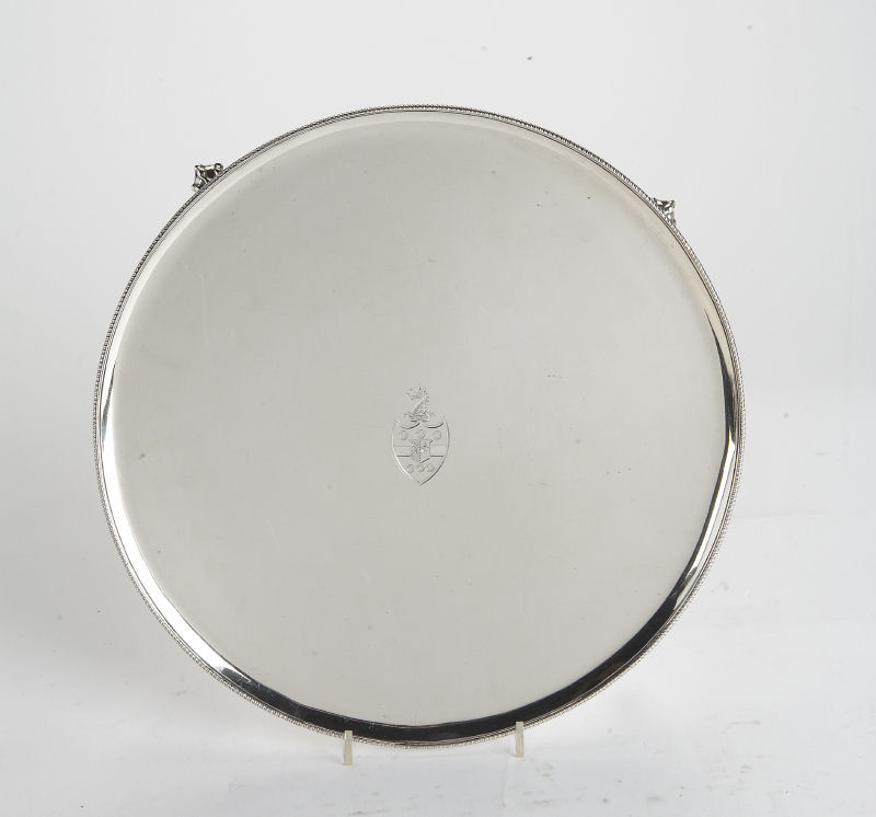 of circular form with fluted and reeded edge, centred by an engraved armorial shield, raised on three scroll feet