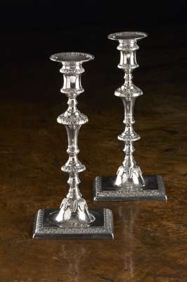 the baluster stems with leaf clasped knops raised on leaf clasped detail to the square bases with engraved coat of arms (2)