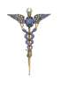the terminal set with a pearl, measuring approximately 5mm diameter, surmounting a claw set oval cut sapphire, flanked by rose cut diamond set and deep blue enamel decorated outstretched wings, above two blue enamel decorated entwined serpents, signed C&AG, for Carl and Arthur Giuliano