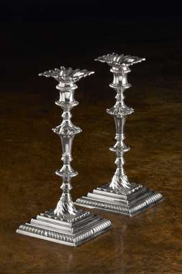 the gadrooned sconces with removable wavy square drip pans, on a circular section stem with gadrooned, shaped and plain knops, raised on a wrythen section onto stepped bases with gadrooned edges (2)