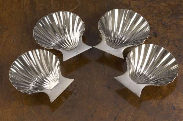 each formed as a clam shell, engraved crest raised on three conch sell cast feet (4)