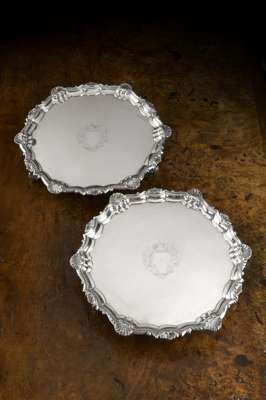 of circular form with a piecrust edge, each centred by an engraved vacant cartouche, raised on three scroll feet (2)