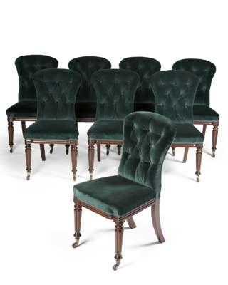 covered in green velvet, the wasted buttoned backs above overstuffed seats on reeded legs with brass cappings and ceramic castors (8)