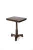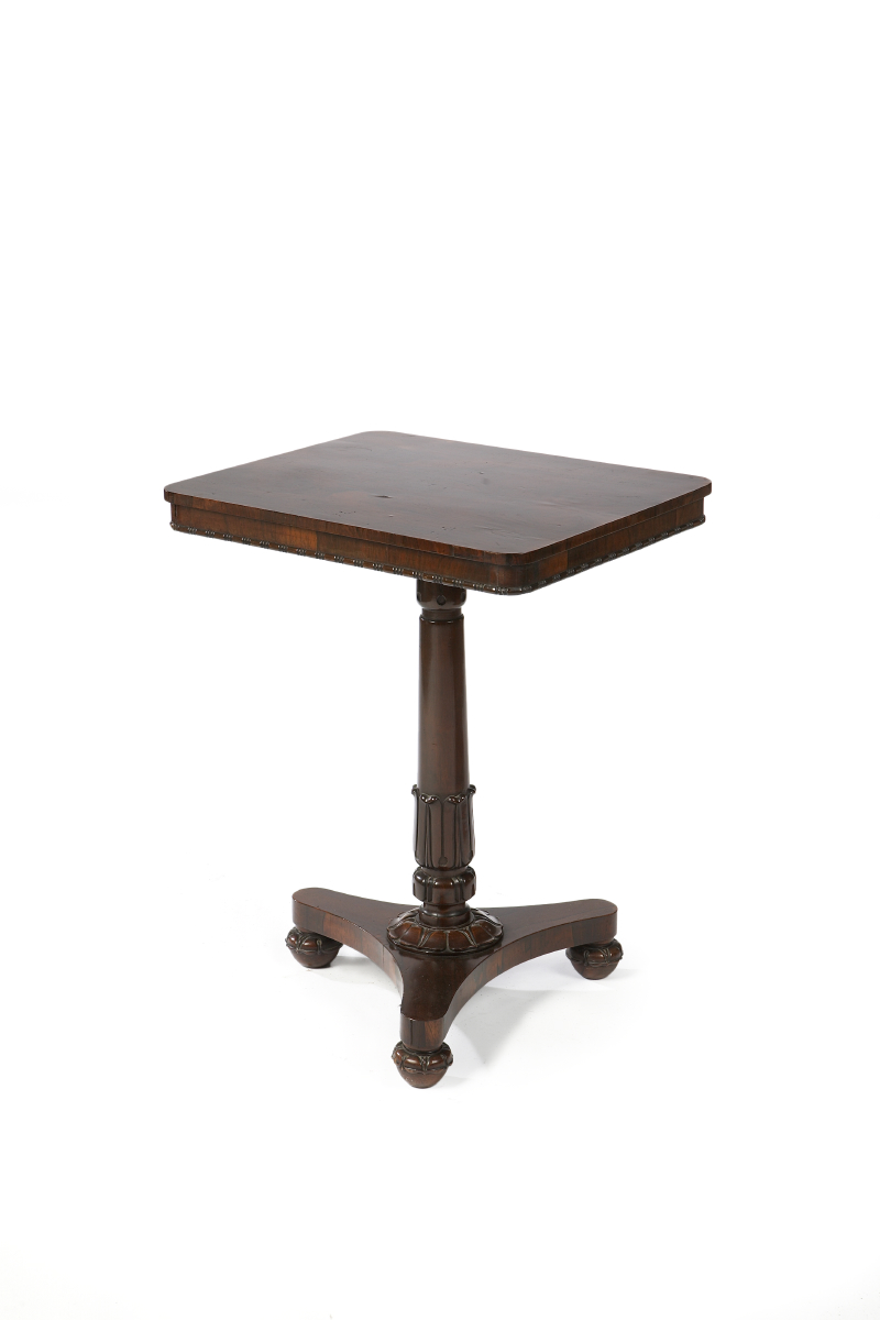 rounded rectangular top with red decorated frieze, lotus leaf carved column on a triform base with bun feet and concealed castors