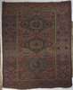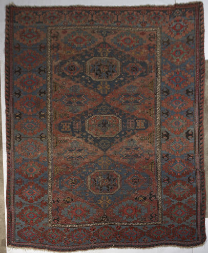 the rust red field with two elongated indigo medallions, within blue medallion border between ivory and red bands 316cm x 268cm