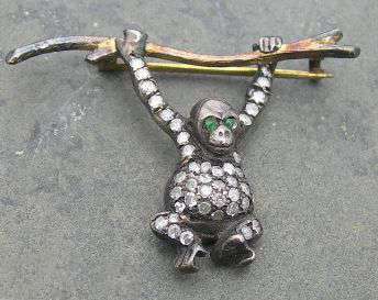 designed as an ape, pavé set with single cut diamonds, with circular cut emerald set eyes, swinging from a scrolling branch