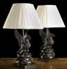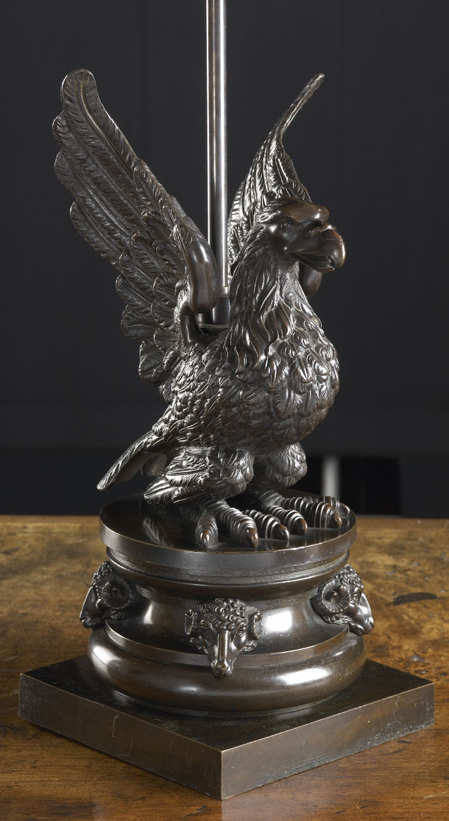 modelled as seated eagles with outspread wings, on circular rams head mounted socles and square plinth buses, with pleated shades (2)