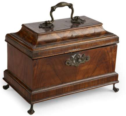the ogee moulded hinged lid, opening to reveal a compartmented interior with brass fittings, raised on later claw and ball feet