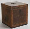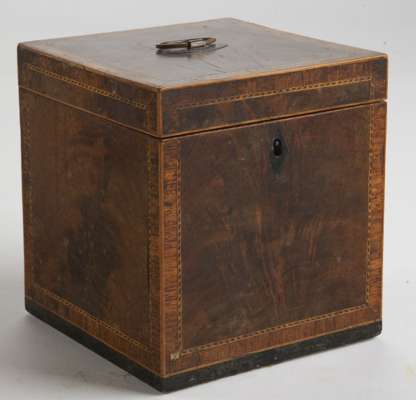 of canted square form, the simulated fluted sides with chequer banding and polka dot -inlaid decoration, centred by oval burrwood panels