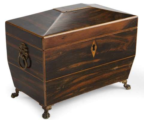 of sarcophagus form, with lions mask and loop handles, the hinged lid opening to reveal two covered compartments, raised on brass claw and ball feet