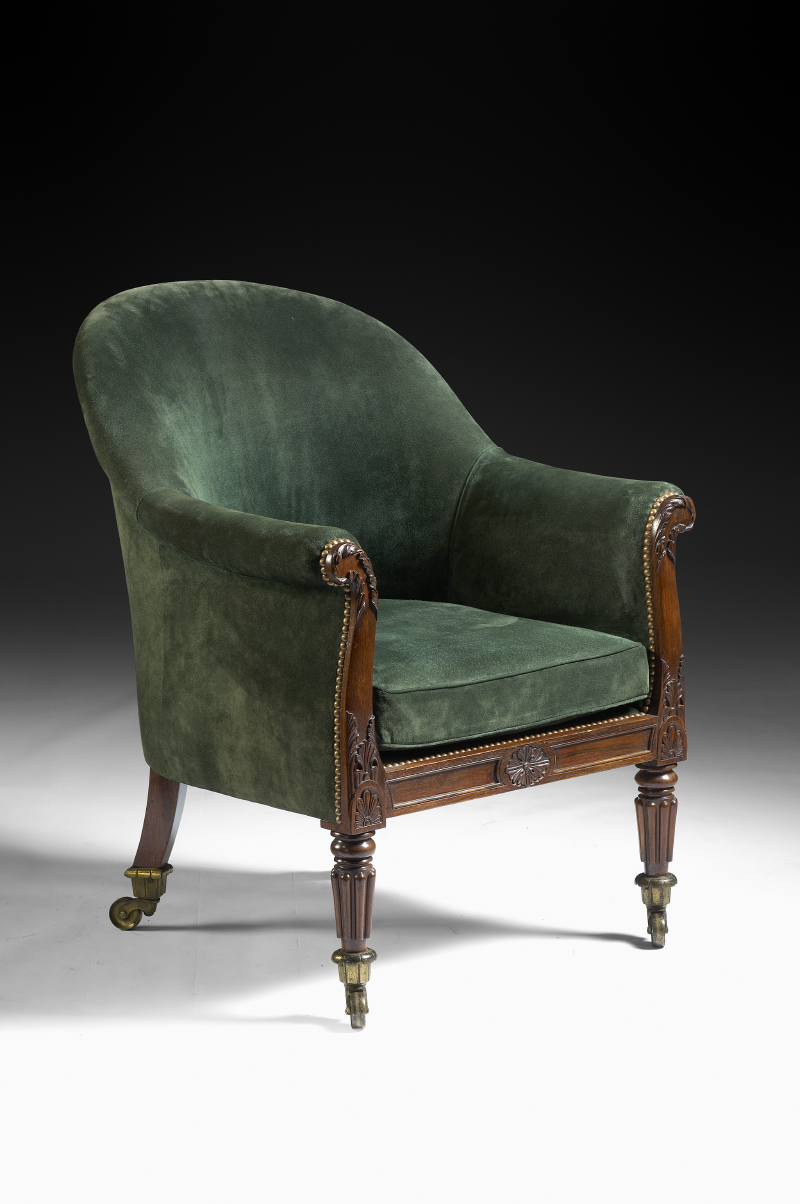 Front rail stamped ‘Gillows Lancaster’ covered in green suede, the scroll arm facings with foliate carving and anthemions above a panelled front rail and reeded tapered legs with ornate brass capping and castors, castors marked ‘Lewty’s’