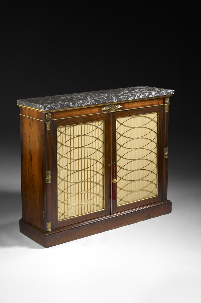 with associated mottled black marble top and brass mounts, the pair of brass grille and pleated fabric doors enclosing the adjustable shelves, flanked by split turned columns with lotus leaf brass cappings on a moulded plinth base