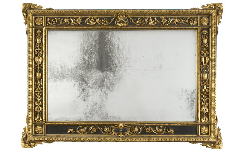 the rectangular plate within margin plates decorated with marlins, scrolling masks, flowering urns and paterae to the corners, the stop-fluted outer frame with foliate scroll corners