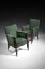 the backs, padded arms and loose seat cushions covered in patterned green fabric, the tapered reeded columnar arm facings above reeded front rails and conforming short tapered legs with brass cappings and castors (2)