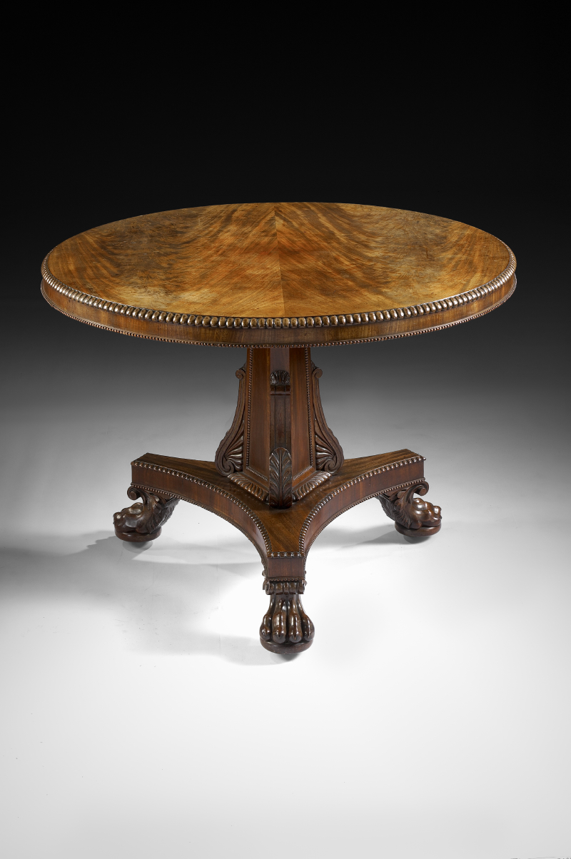 the mirror veneered circular tilt top with a gadrooned edge on a beaded panelled triform stem with leaf scroll corners, the concave triform plinth on bold hairy paw feet with concealed castors