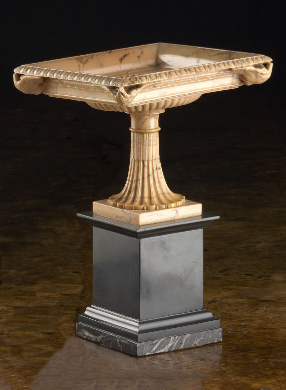 of square lobed form with gadrooned edge and stylized swans to the corners, on a fluted spreading stem and rectangular base, the whole on a black slate stepped square pedestal
