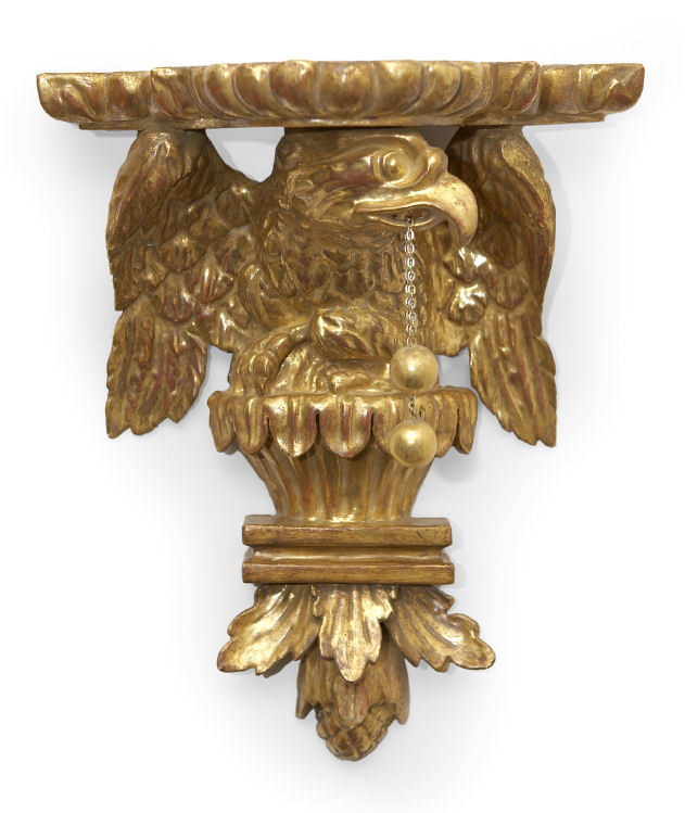 each in the form of crouching eagles upholding gadrooned triform platforms and suspending twin orbs, on leafy pine cone finial bases (2)