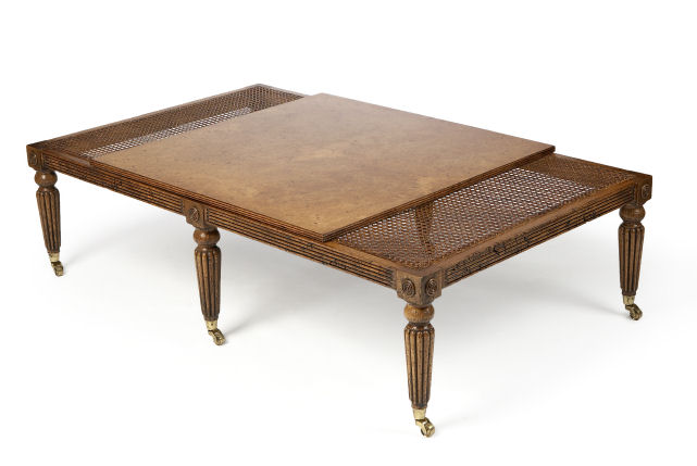 the rectangular cane top surmounted by a removable veneered centre section above a reeded frieze and raised on turned and reeded legs terminating in brass cappings and castors