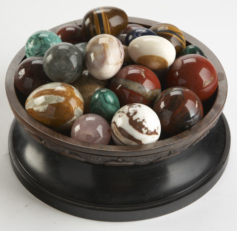 A collection of hardstone, marble and ivory eggs and spheres