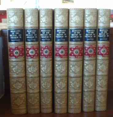 Memoirs of the reign of King George the second … Second edition, revised. London: Henry Colburn, 1847. 3 volumes, 8vo., engraved portrait frontispieces to each volume; Memoirs of the reign of George the third. London: Richard Bentley, 1845. First edition, 4 volumes, engraved portrait frontispieces to each volume, uniformly bound with the preceding in light tan calf, spines decorated gilt in compartments, red and black morocco lettering pieces, some light offsetting from the frontispieces, small circular blind library stamp partially erased from the titlepages of the second work. [7]