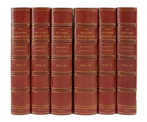 The Second World War. London: Cassell, 1949-54. 6 volumes, all first editions, except for volume 1 which is the 1949 new revised edition, maps, plans (including some folding), contemporary half red morocco, red cloth boards, t.e.g., bound for the firm of Robert Stedman by Sangorski & Sutcliffe, with a facsimile note from Churchill loosely inserted at the front of volume 1. [6]