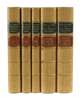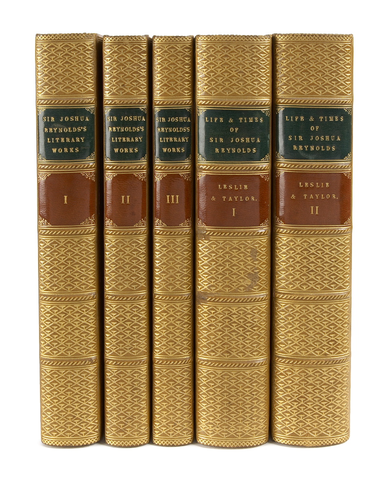 The literary works … to which is prefixed some account of the life of the author by Edmund Malone … the fifth edition corrected … London: Cadell & Davies, 1819. 3 volumes, 8vo., engraved portrait frontispiece in volume 1; Leslie, C.R. & Taylor, T. Life and times of Sir Joshua Reynolds. London: Murray, 1865. 2 volumes, 8vo., engraved portrait frontispieces, plates, uniformly bound with the preceding volumes in later light tan calf, spine decorated gilt in compartments, black and red morocco lettering pieces, a.e.g., by Leighton, with the Halton House bookplates of Alfred de Rothschild. [5]
