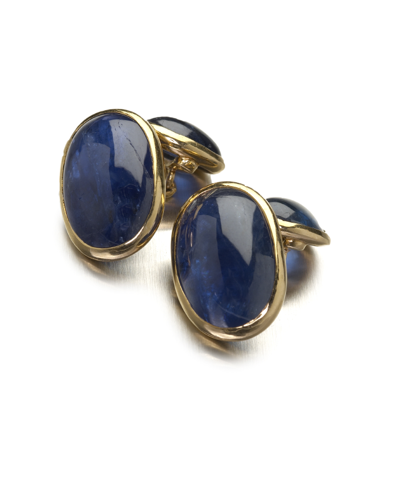 the graduated terminals each collet set with an oval cut sapphire cabochon, each sapphire of a pleasing intense blue hue, signed and stamped OR 750