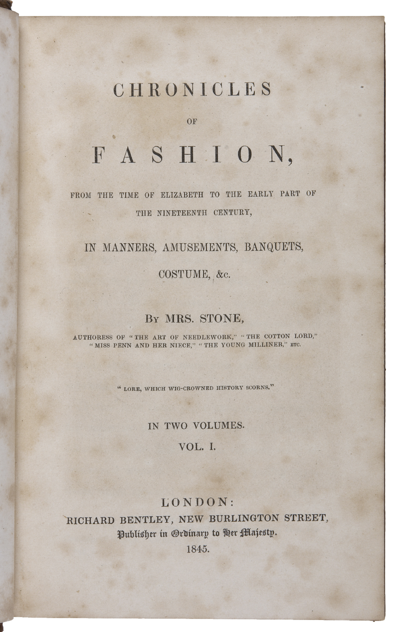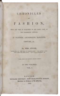 Chronicles of fashion from the time of Elizabeth to the early part of the nineteenth cenury, in manners, amusements, banquets, costume, &c. London: Richard Bentley, 1845. First edition, 2 volumes, 8vo., engraved frontispiece to each volume and 13 other engraved plates, contemporary calf, spine decorated gilt in compartments, red and green morocco lettering pieces, by Leighton, covers slightly spotted, spotting of the frontispieces and plates. [2]