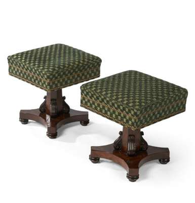 the square upholstered tops raised above facetted columns with scroll brackets, the quatreform bases with bun feet (2)