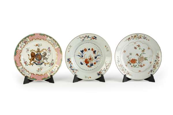 one Imari, one famille rose and the other Verte Imari; together with a Samson famille rose armorial plate and a Chinese Imari porcelain bowl (5)