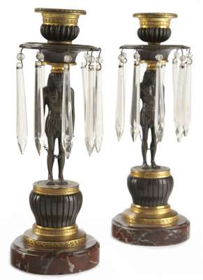 in the Empire taste, the dished drip pans hung with faceted drops and upheld by Egyptian male figures raised on bulbous plinths with gilt bronze collars and circular rouge marble bases (2)