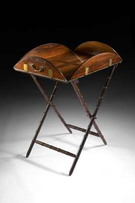 with four arched, hinged sides on a simulated bamboo X-frame folding stand