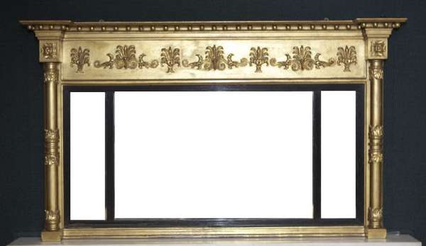 the inverted breakfront cornice with applied ball spacers, above an anthemion-decorated frieze, below a central bevelled plate flanked by two smaller mirror plates within ebonised reeded slip frames, the whole enclosed by leaf carved columns