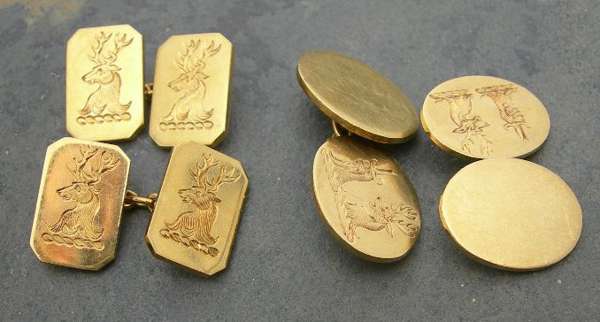with oval terminals, conjoined by belcher links, the fronts crested with an upright bear’s paw holding a broken sword for CONSTANTINE; also another pair of 18ct gold cufflinks, with crested canted rectangular terminals, similarly conjoined (2)