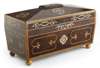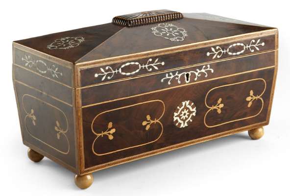 elaborately inlaid throughout with boxwood stringing, ivory flowerheads, roundels and mother of pearl, the hinged lid revealing a central cut glass bowl flanked by lidded compartments, the underside of lid radial veneered, the whole raised on ball feet